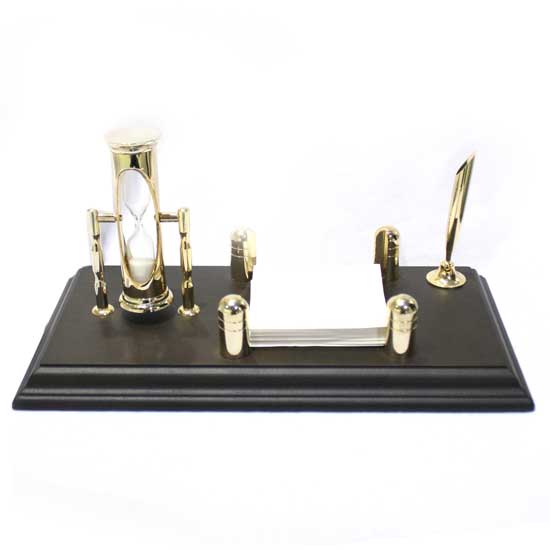 This beautiful stationery set includes a pen holder, memo holder, and a miniature clock. The elegant design makes this stationery set a brilliant piece to dress up an executive office desk. This sophisticated stationery set is also the perfect gift for friends.