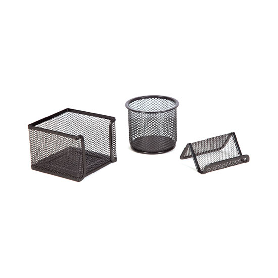 This is a stationery set that comes with three different pieces. Each piece features a mesh body in black. This set is a practical choice for office use.