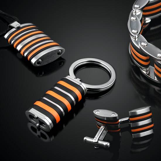 The classy steel jewelry set features stripes for adding class and style. The set comes with bangle, cuff-links and more for you to mix and match. The refined finishing simply makes it stand out from the rest.