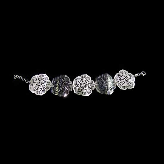 This eye-catching bracelet features five rose-shaped charms in a cutout design. The jewelry is finely crafted of sterling silver in a polished finish. The lobster claw closure completes the look of the jewelry.