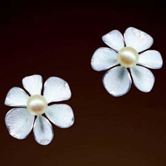 This pair of sterling silver earrings features an elegant floral design. The petals are nicely polished to shine with enchanting silvery radiance. A lustrous pearl is lodged in as the bud.