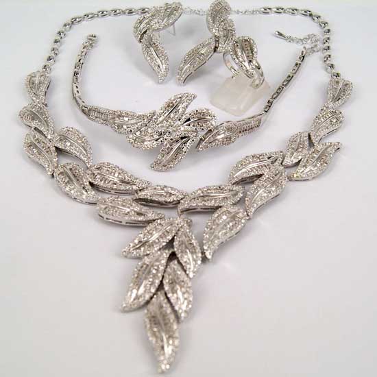 This 925 silver jewelry set includes a necklace, a bracelet, a ring and a pair of earrings. Each features leaf-shaped elements set with dazzling stones which are elegant. Add these splendid pieces to your jewelry box.