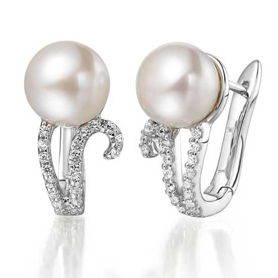 This English clip earring in sterling silver is rhodium plated for long lasting shine. It is ornamented with a glossy round freshwater pearl for a deluxe touch. This fancy and elegant earring is completed with twinkling cubic zirconia stones.