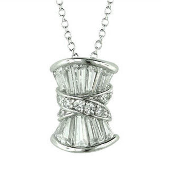 Pictured is a pendant finely crafted with 925 sterling silver and white CZ stones. The baguette-cut CZ stones are gathered at the middle with a belt encrusted with small sparkling stones. This pendant makes a lovely fashion accessory for ladies.