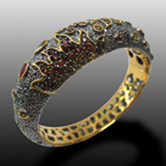 Featured here is a sterling silver ring with subtle flame patterns. The semi-precious stone accents add a whimsical touch. Add an exotic flair to your outfit with this ring on your finger.