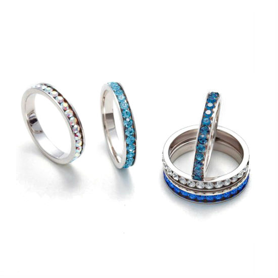 Showing is a fashionable piece of silver ring with crystal stones all around the band. The ring is finely made with inconceivable details. Silver ring band is accessorizing admirably with glittering bead-like stones, adding glistening element to the ring. This humble yet dazzling ring is the perfect choice for everyday wear.