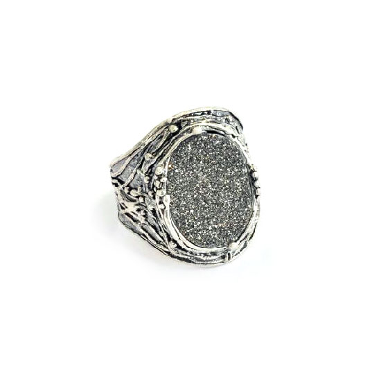 This bold silver ring features a druzy design for an eye-catching look. The silver band is carved with delicate details. It pairs well with metal jewelry for a trendily metallic style.