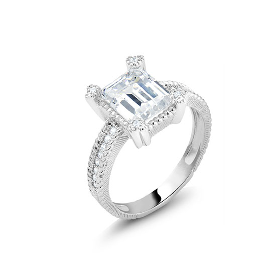 This sterling silver ring features an emerald-cut CZ stone as the centerpiece. The CZ stone embellishments set in the silver band shine beautifully. The polished ring design also renders an elegant touch to the finger ring.