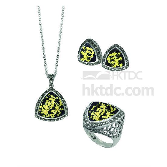 This is high class jewelry set that consists of a necklace, a pair of earrings and a finger ring with the same design. The black marcasite gemstone accents each jewelry piece with a sense of elegance. The triangle shaped setting crafted of sterling silver ensures a gorgeous jewelry set.