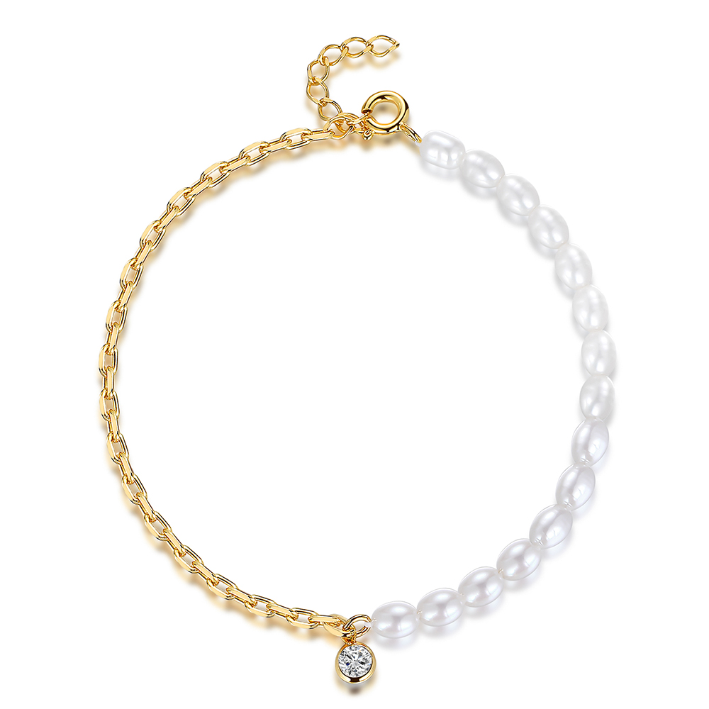 STERLING SILVER BRACELET WITH 4-4.5MM OVAL FRESHWATER PEARL AND CZ, CHAMPAGNE GOLD PLATED, 7"+1" EXTENSION
