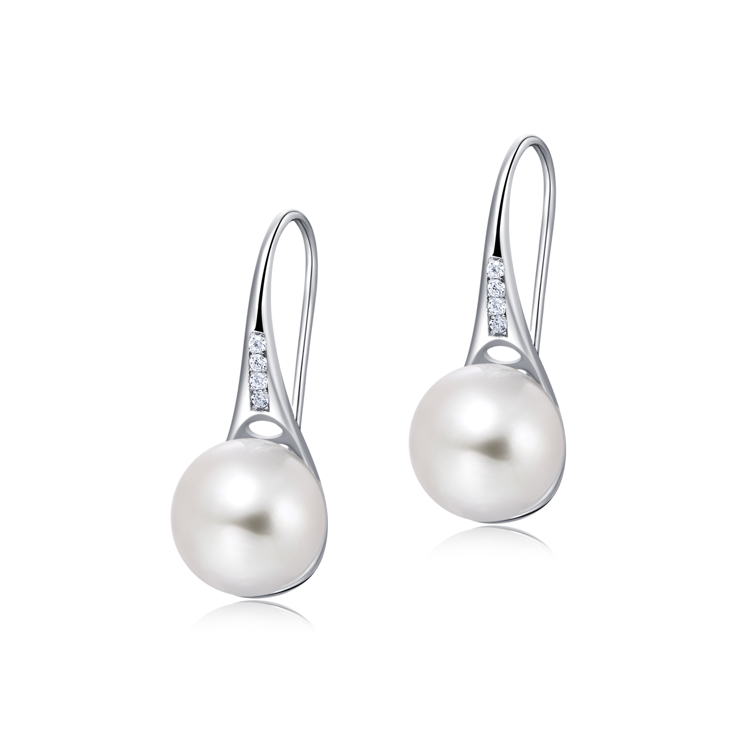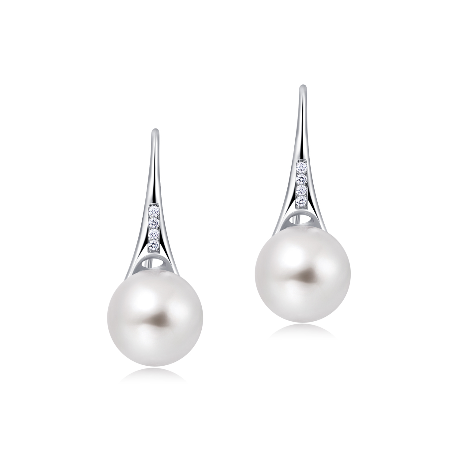 STERLING SILVER EARRINGS WITH 8.5-9MM WHITE ROUND FRESHWATER PEARL AND WHITE CZ, RHODIUM PLATED