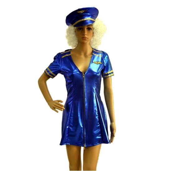 This sexy stewardess costume set includes a thigh-length dress and a hat. The shiny blue dress features a V-neck and front zipper closure. The eye-catching stewardess costume set is perfect for assorted parties, carnivals and special occasions.