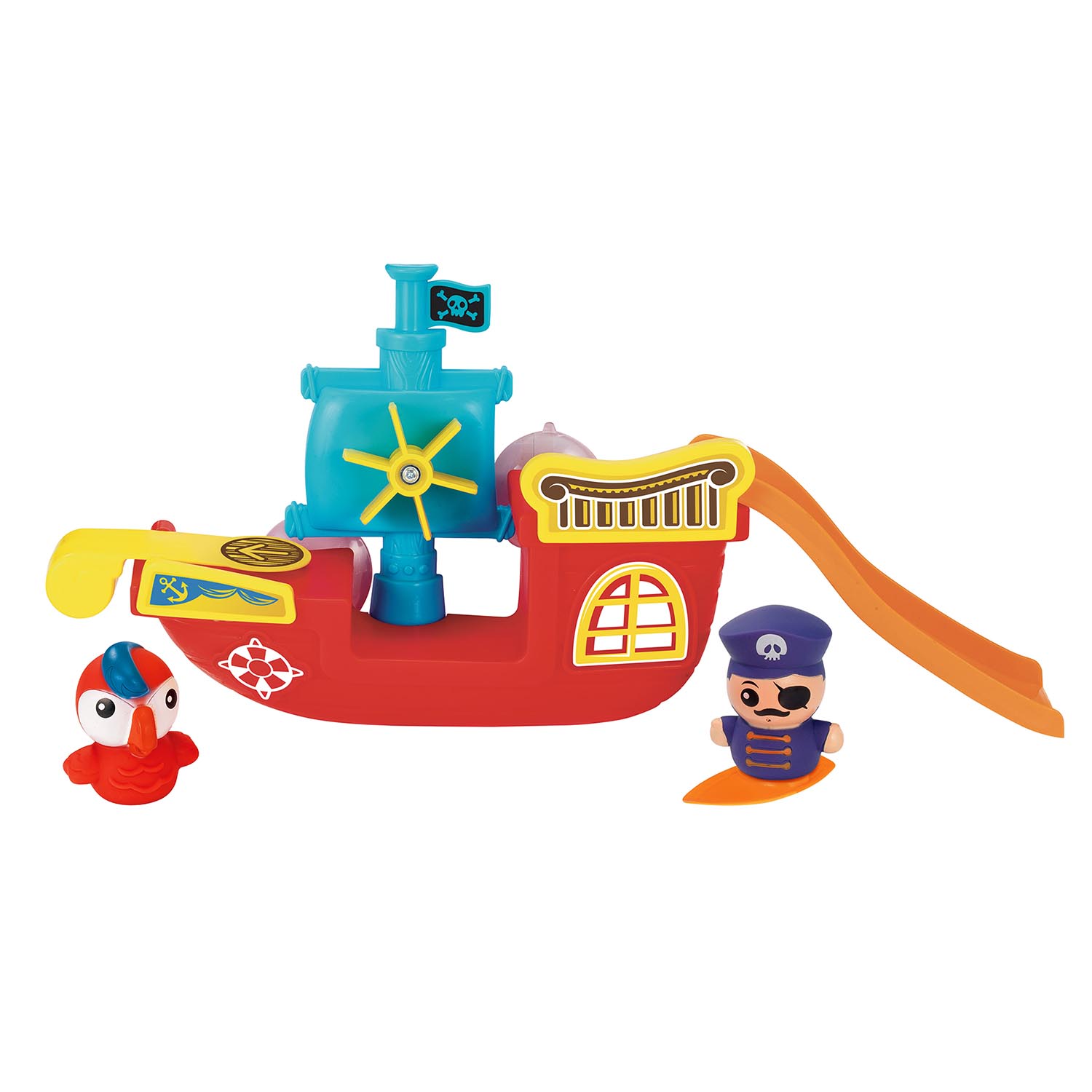 Stick the pirate ship on wall. Working water wheel. Bouncy board. Water slide. Includes surfboard for two squirt toys.