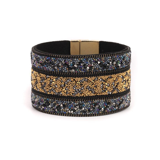 This wide bangle comes with a fashionable appearance. It is crafted with crystal stones and natural stones for an eye-catching look. This well-designed bangle is finished with an alloy buckle.