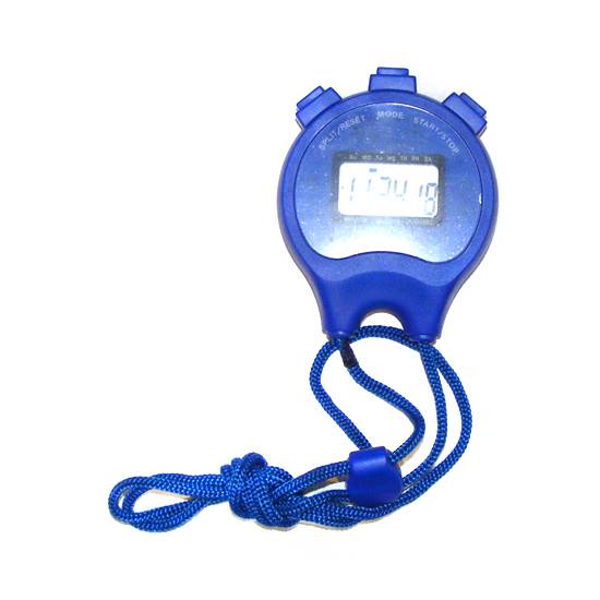 The featuring product is a stop watch with a six-digit display. It has a time-setting alarm function and on/off chime. There are three buttons on top and has a long neck strap.