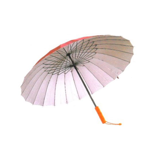 This is a straight umbrella with a stick handle. It features a polyester canopy in a solid color with a silver plated exterior. The robust frame promises an extended service life.
