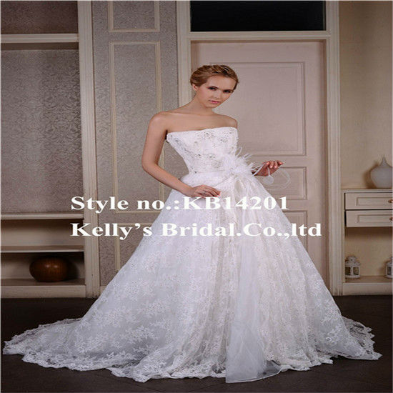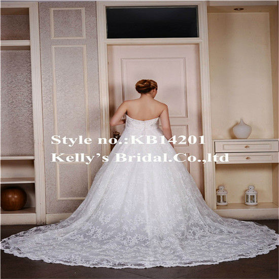 Backless design with sleeves, This dreses is very special, appliqued lace and beaded bodice, whole french lace as the overlay skirt, a big and round train, what's more there is a satin with hand made flower.