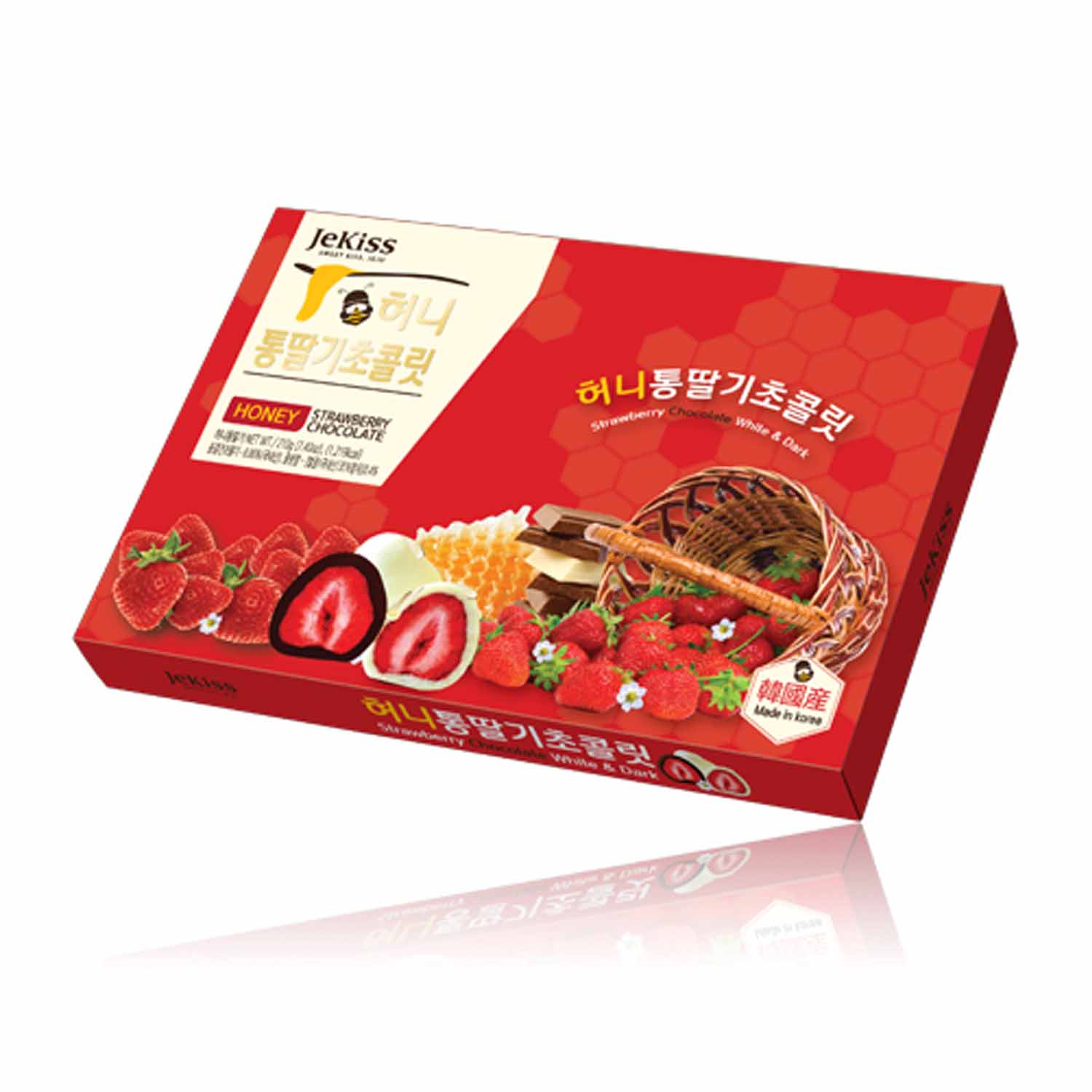Pure Freeze Dried Strawberries Dipped In The Chocolate. We Are Using Only 100% Made In Korea Whole Strawberries And Honey Powder For The Rich Taste. JeKiss Honey Strawberry Chocolate Is Real Tasty And Crunchy Chocolate, Along With Super Health Benefits! There Are Whole Pieces Of Crispy Strawberry In Each Bite And Can Feel The Rich Fruit Flavor With The Chocolate. Also Quality Control Is Our High Priority and Always Obey HACCP System Verified With ISO22000. Clean and Premium Chocolate Made In Jeju, Designated As The World'S Natural Heritage. JeKiss Presents Abundant And Beautiful Nature For You.