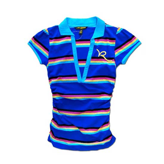 This ladies' T-shirt features multi-color stripe patterns. The unique T-shirt features a spread collar and a deep V-neck. The slim waist finishes the look of this T-shirt.