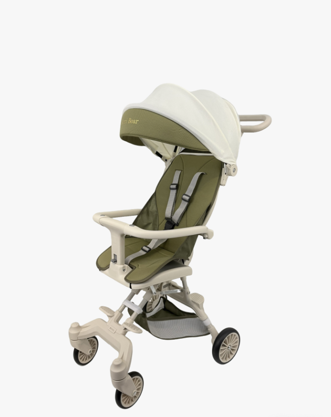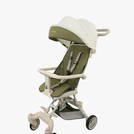 2. 结构设计:采用高景观座椅设计,搭配五点式安全带与可拆卸护栏,保障孩子乘坐安全;顶部有可调节遮阳篷,能遮挡阳光与风雨;底部为四轮结构,前轮万向轮带刹车,推行灵活且稳定。