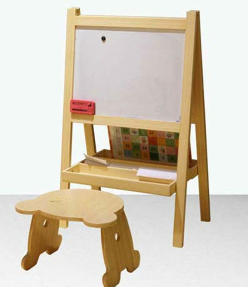 The white wood table with an easel, chalkboard, two stools and storage compartment will set young artists up for fun and play.