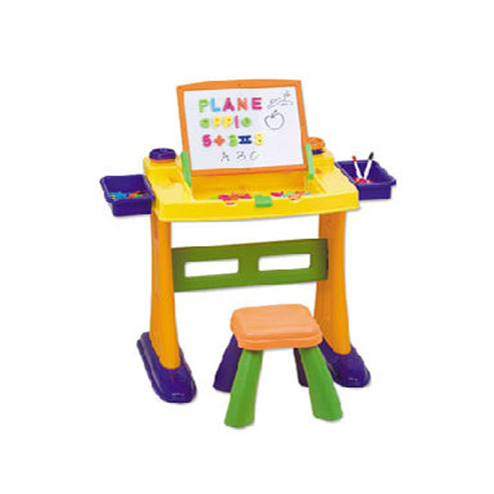 This study table set features a collapsible art desk and a baby chair. The drawing board is attached onto the desk for children to write and draw. Made of top quality materials, this study table set is safe for children to use.