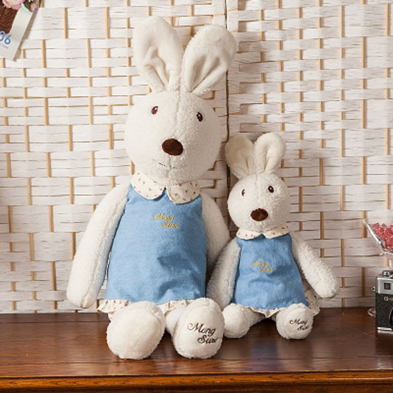 This is a stuffed animal coming in a rabbit shape. The rabbit is wearing a blue, sleeveless dress for a lovely appearance. It makes an ideal gift for your children.