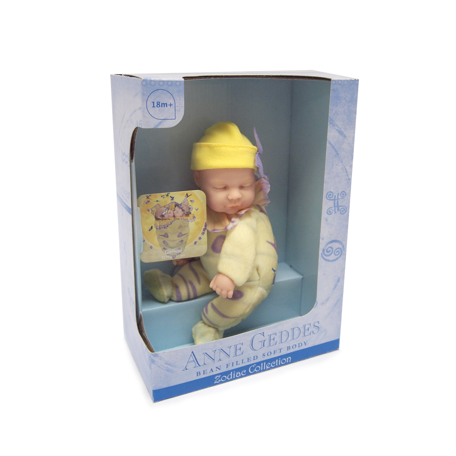 Highlighted here is a stuffed baby doll with a Gemini theme. The baby looks lovely with a chubby face, closed eyes and a pouting mouth. It is dressed in overalls with flower pedals around the neck and is wearing a cap with a butterfly ornament.
