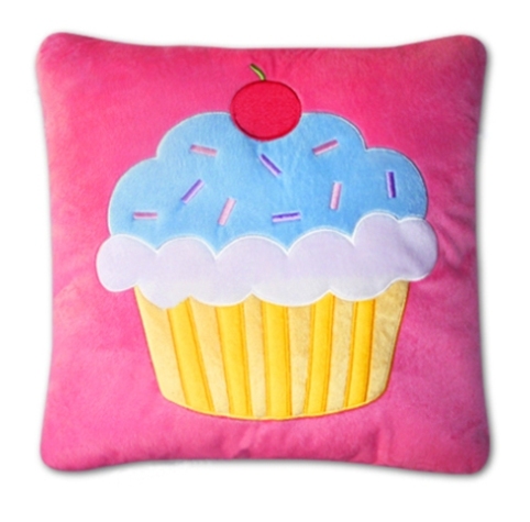 The pictured pillow boasts a flattering look in tinge of pink. It is characterized by a square shaped design, coming with a stuffed construction for added coziness. Beautifully graced with a cherry cupcake adornment, this fluffy pillow further emphasizes a heart capturing sweetness.