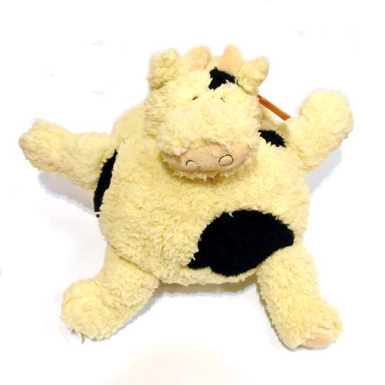 This is a stuffed toy decorated as a cow. The toy is of cream and black in colour. The toy is equipped with handle.