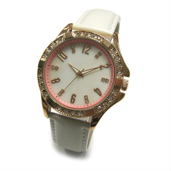 This fashionable quartz analog watch features a round-shaped metallic watch case. The MOP dial is designed with stylish distorted numeral markers.