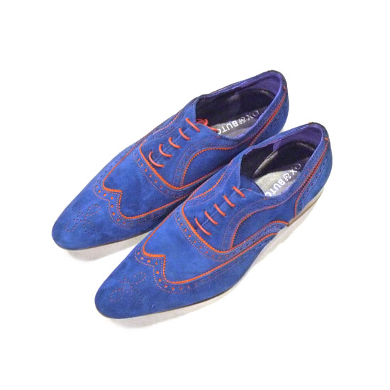 This is a pair of laced shoes with a modern and fashionable design. Each piece features a bright blue upper with orange accents and an orange shoelace. The elevated sole completes this design for a more stylish look.