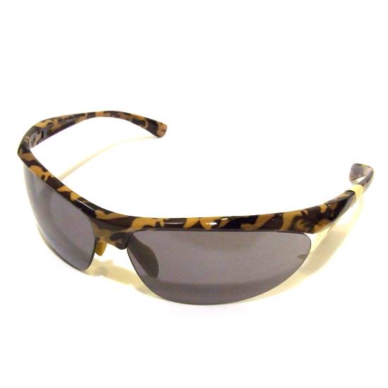 This is a pair of sunglasses in brown camo pattern. The frame is made of plastic and in stylish design. The lens are in light grey.
