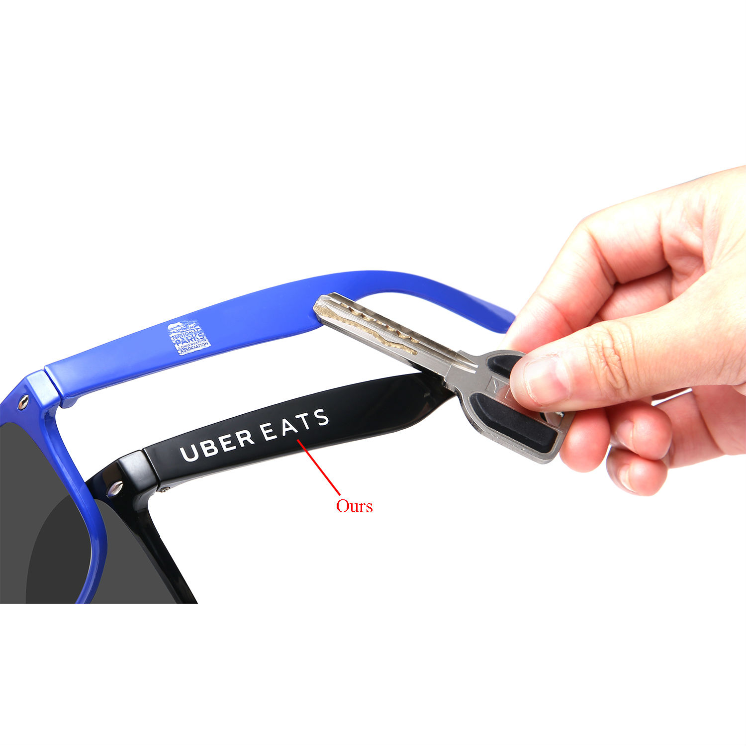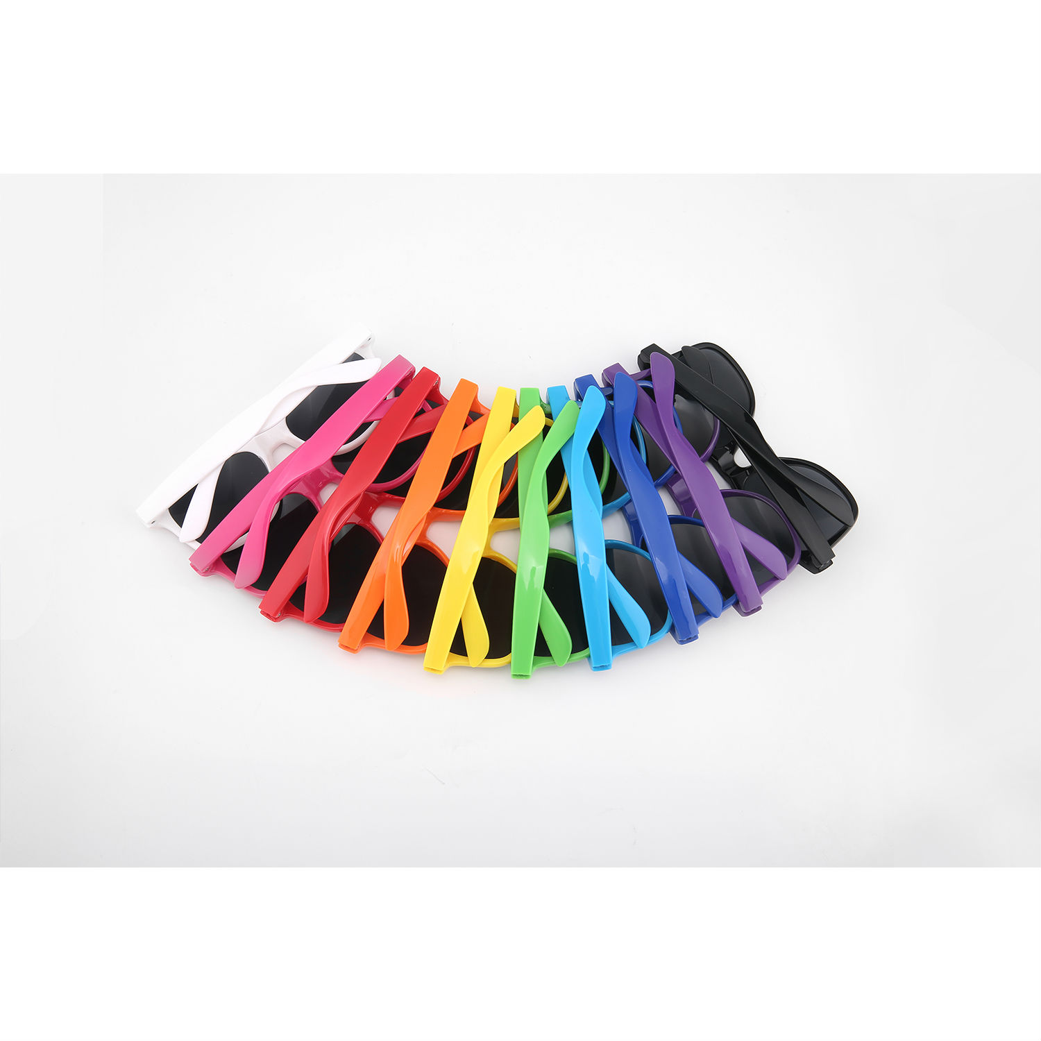 Sunglasses with high quality UV400 protection lens, classic branded promotional sunglasses for party, wedding use, as gift and so on. We provide logo design and printing service, the printing method include Silk screen printing, Heat transfer printing, Water transfer printing, UV printing and so on. Low MOQ, favorable factory price, fast delivery by DHL/UPS/FedEx.