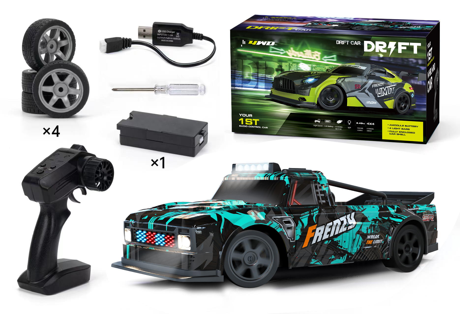 Forward, backward, turn left, turn right, four-wheel drive, replaceable tires, drift, front and rear bottom lights, modular battery, PVC all-inclusive body