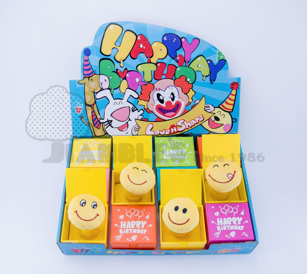 The plush character will pop up and sing Happy Birthday song when the box is opened.