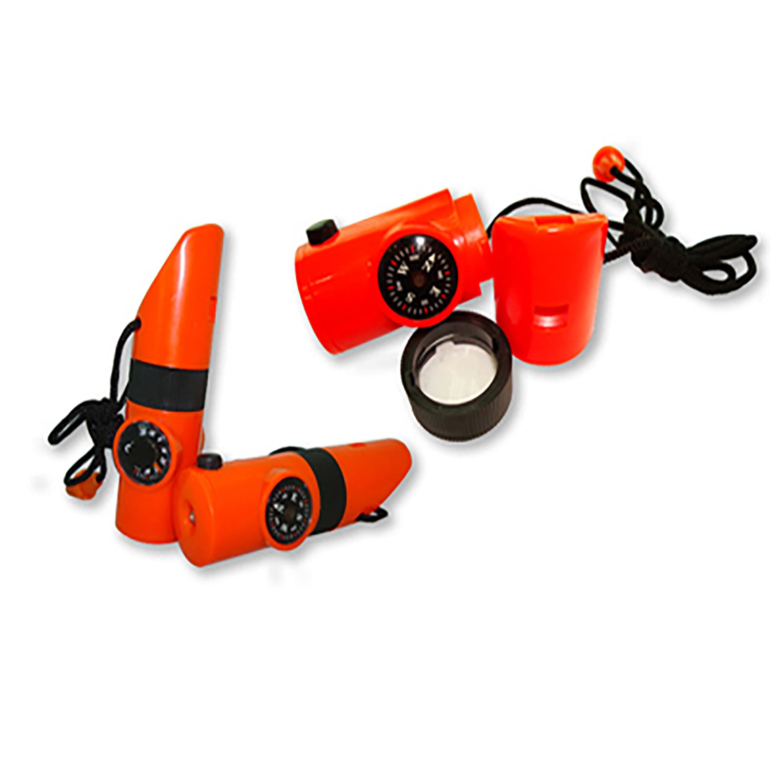 Multi functional survival whistle kit with LED flashlight, compass, rescue mirror includes the following features:
