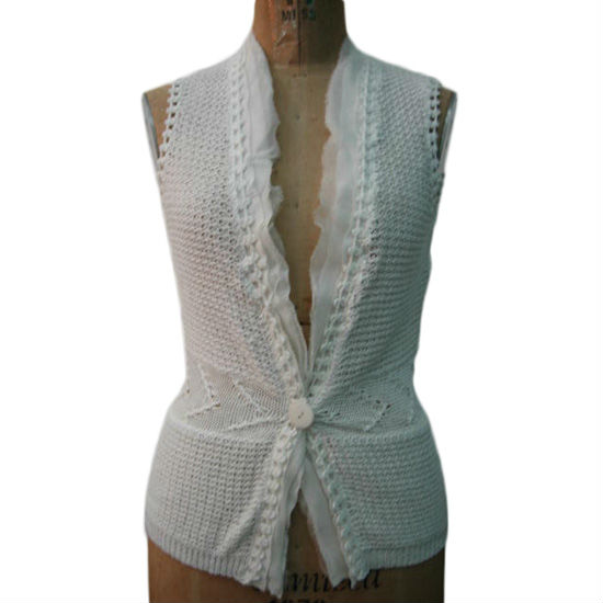 Stay warm in the comfort of this sweet sweater vest that flaunts a V-shaped neckline with single button closure. The knitted conduct exudes a graceful look while depicting simple patterns on the waist to capture gazes. Layered ruffles are further crafted on the placket to add style.