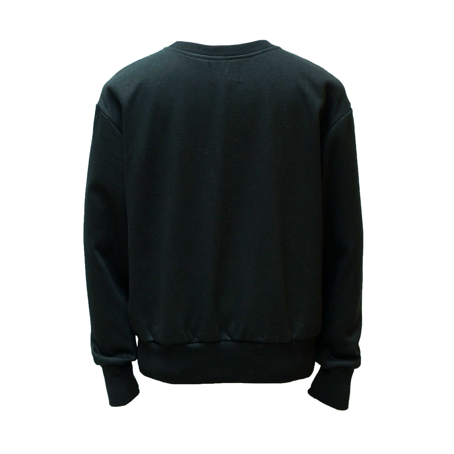 Long sleeve crewneck sweatshirt in black. Navy flocking and PU camouflage pattern at front. Fleece interior. Tonal stitching. Ribbed crewneck collar, cuffs, and hem.