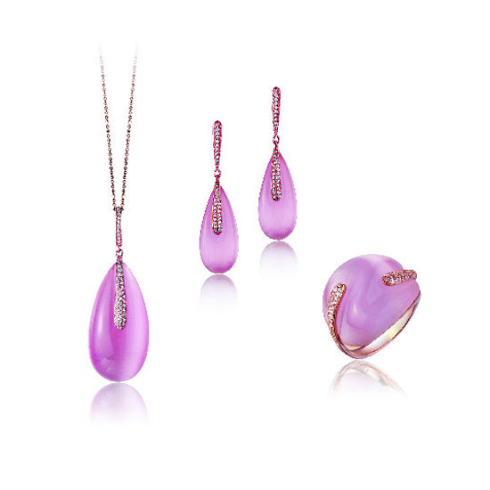 This elegant jewelry set flaunts a feminine flair with its alluring glints in bright pink. The earrings and pendant feature pear-cut synthetic cat's eye stones for an exquisite touch. The ring with a large center stone also boasts a sophisticated style.