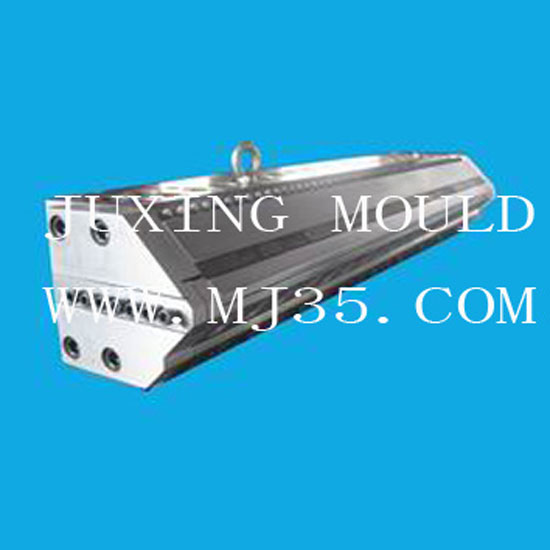 Pictured is a T-die with an integrated port, manifold, restrictor, relaxation chamber and lips. The machinery is great for making various plastic molds and sheets. It is built with high precision to ensure reliable performance.