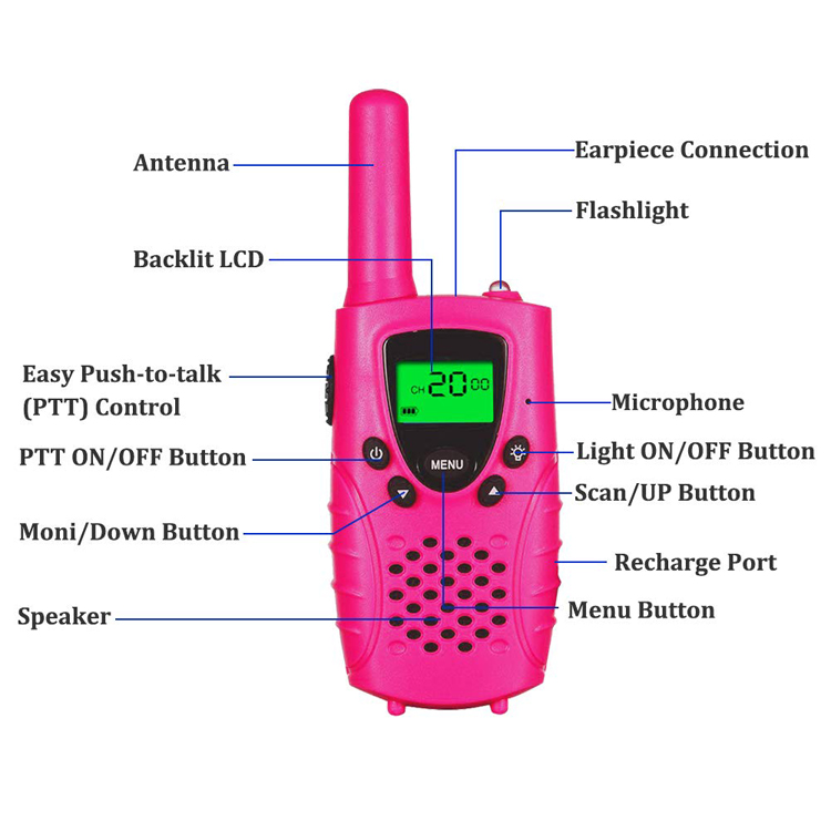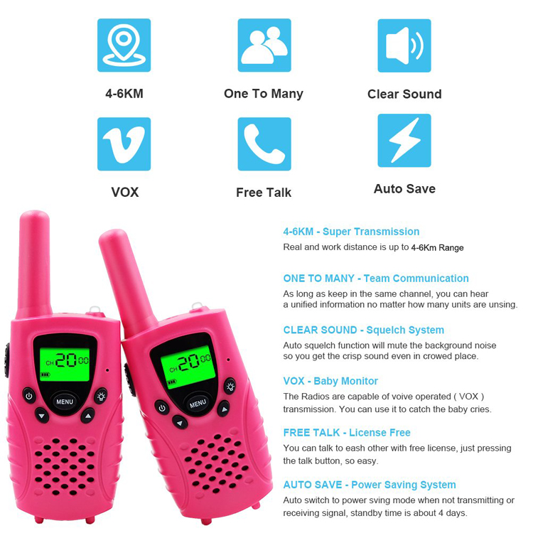 VOX(hands free), Scan, Monitor, battery saving system, Low battery indicator, USB charging,