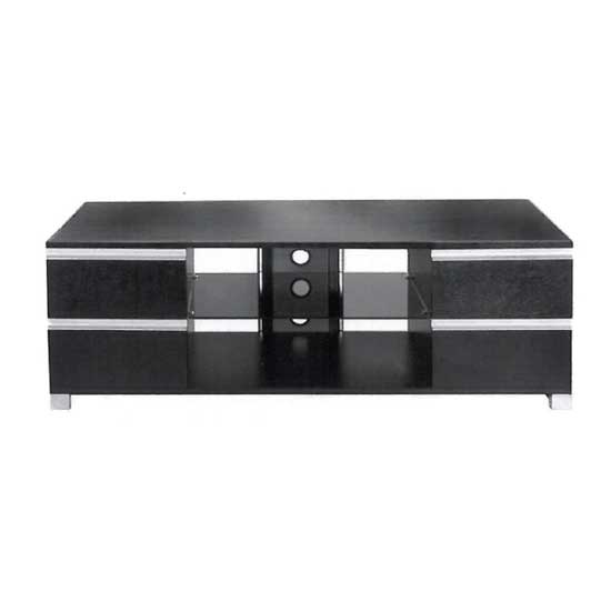 The TV stand is made of black wood with a smooth PVC veneer. It comes with 4 sliding-out drawers with aluminum handles. This TV stand can fit plasma and LCD TVs of up to 64”.
