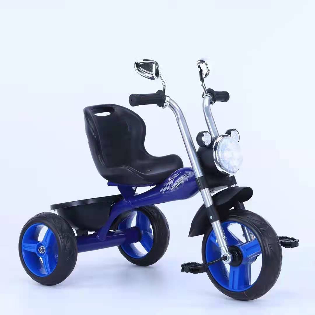 0.9mm thickened steel frame similar moto model, 0.8mm steel fork, safe and environmentally friendly handlebars, beautiful plastic wheel with EVA tire , more soft enlarged seats, one click installation, children tricycle with light and music, enlarged rear basket, matte baking varnish, anti roll setting