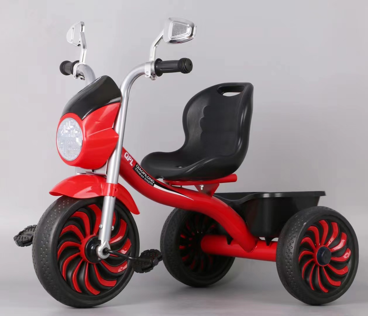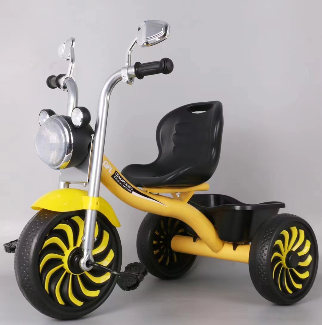 0.9mm thickened steel frame similar moto model, 0.8mm steel fork, safe and environmentally friendly handlebars, beautiful plastic wheel with EVA tire , more soft enlarged seats, one click installation, children tricycle with light and music, enlarged rear basket, matte baking varnish, anti roll setting