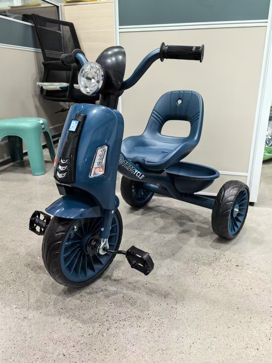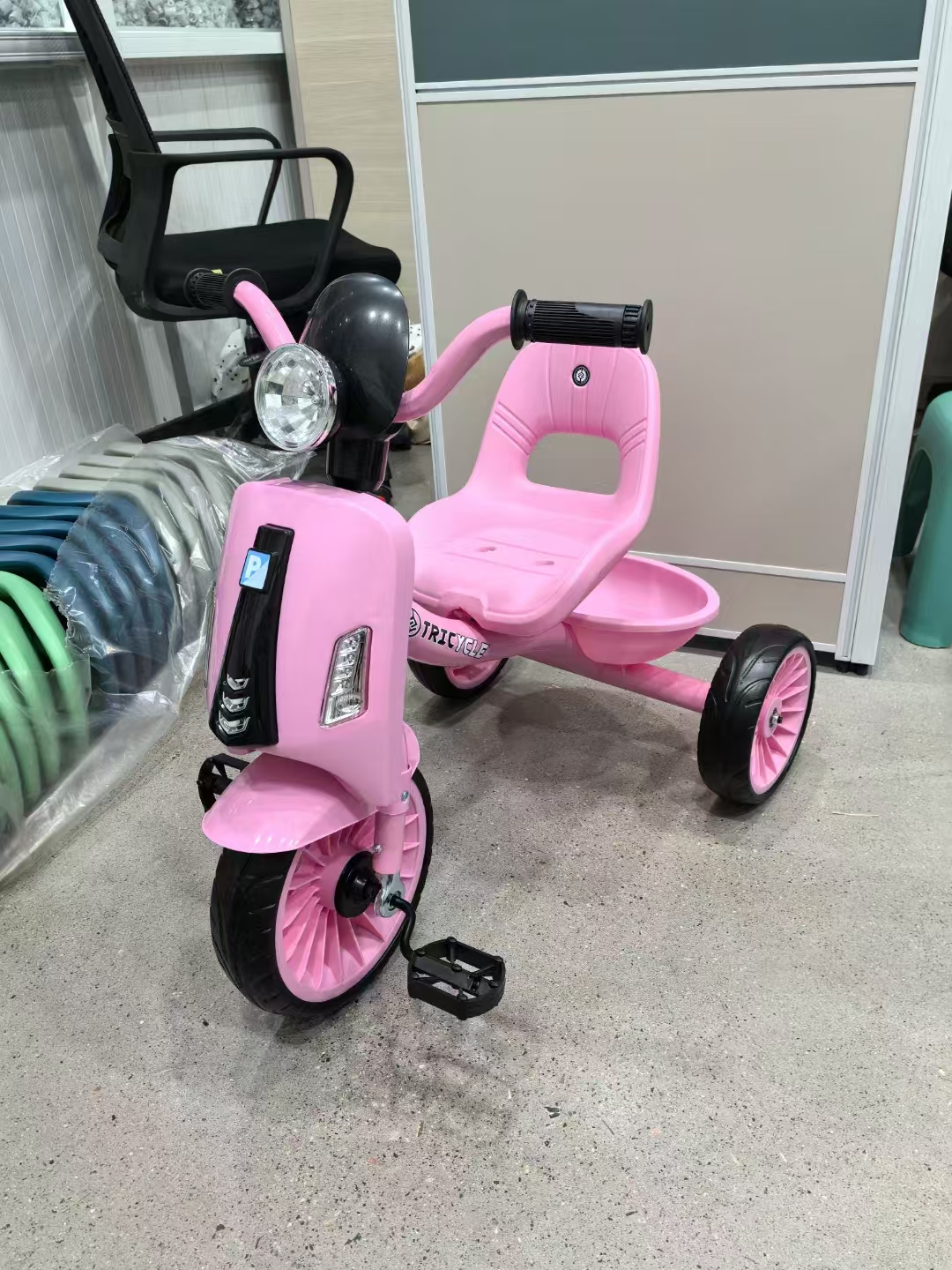 0.9mm thickened steel frame similar moto model, 0.8mm steel fork, safe and environmentally friendly handlebars, beautiful plastic wheel with EVA tire , more soft enlarged seats, one click installation, children tricycle with light and music, enlarged rear basket, matte baking varnish, anti roll setting