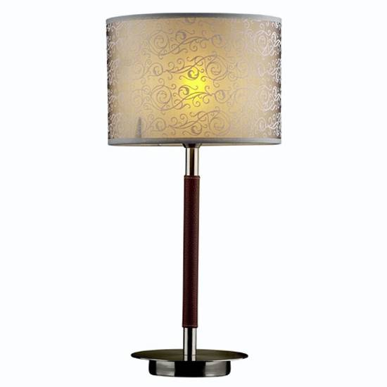 This modern lamp features a circular base and a stand with a mixture of metal and leather. The fabric shade comes with elegant patterns all over, radiating a soft and warm glow throughout your room with enriched mood. It blends seamlessly into any decor.