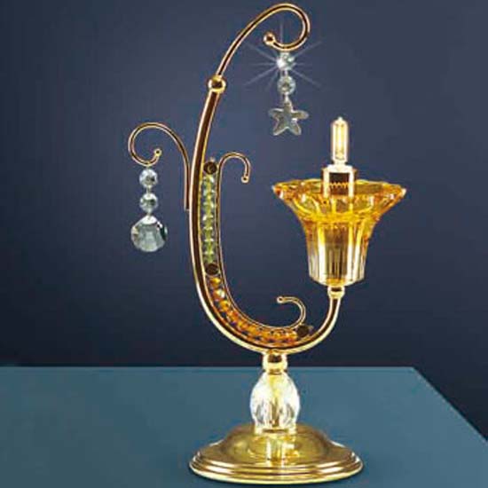 The luscious table lamp is delicately constructed of a swirling frame with sparkling crystals. It is operated by a single lamp housed in a candle holder. Add an exotic touch to any interior space with this crystal table lamp.