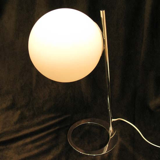 Displayed is a table lamp with a unique design. It comes with a ball-shaped lampshade supported by a tilted metal pole with glossy chrome finishing. This table lamp makes a lovely lighting decoration for your table.