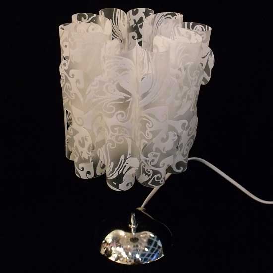 The extraordinary table lamp features a floral-shaped transparent lampshade. The lampshade is crafted with comely swirly patterns that make the lamp an artwork. This lamp adds colors to the surrounding while diffusing bright light.